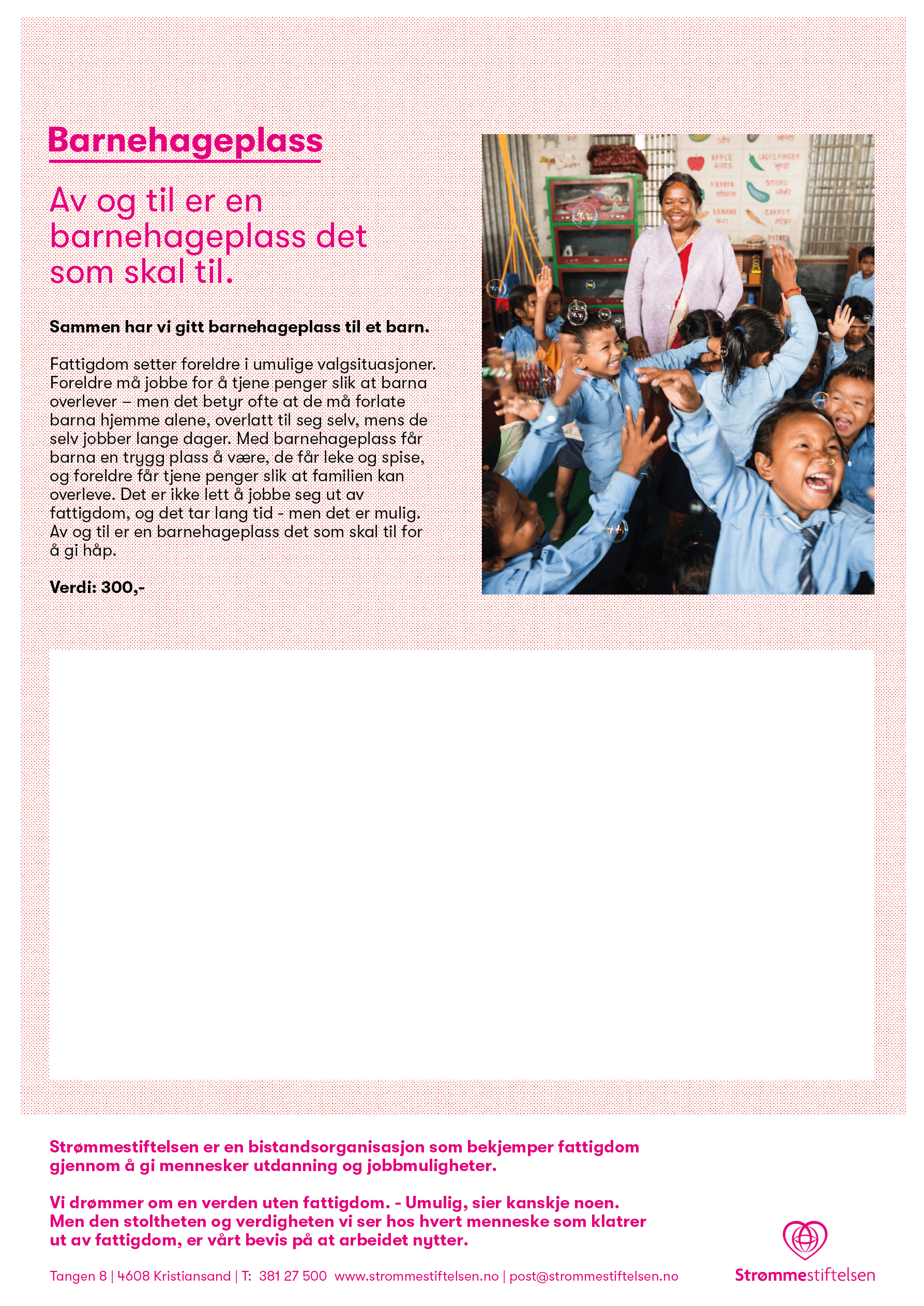 * Dette er en symbolsk gave. Pengene fra denne gaven går til å støtte dem som til enhver tid trenger det aller mest.
