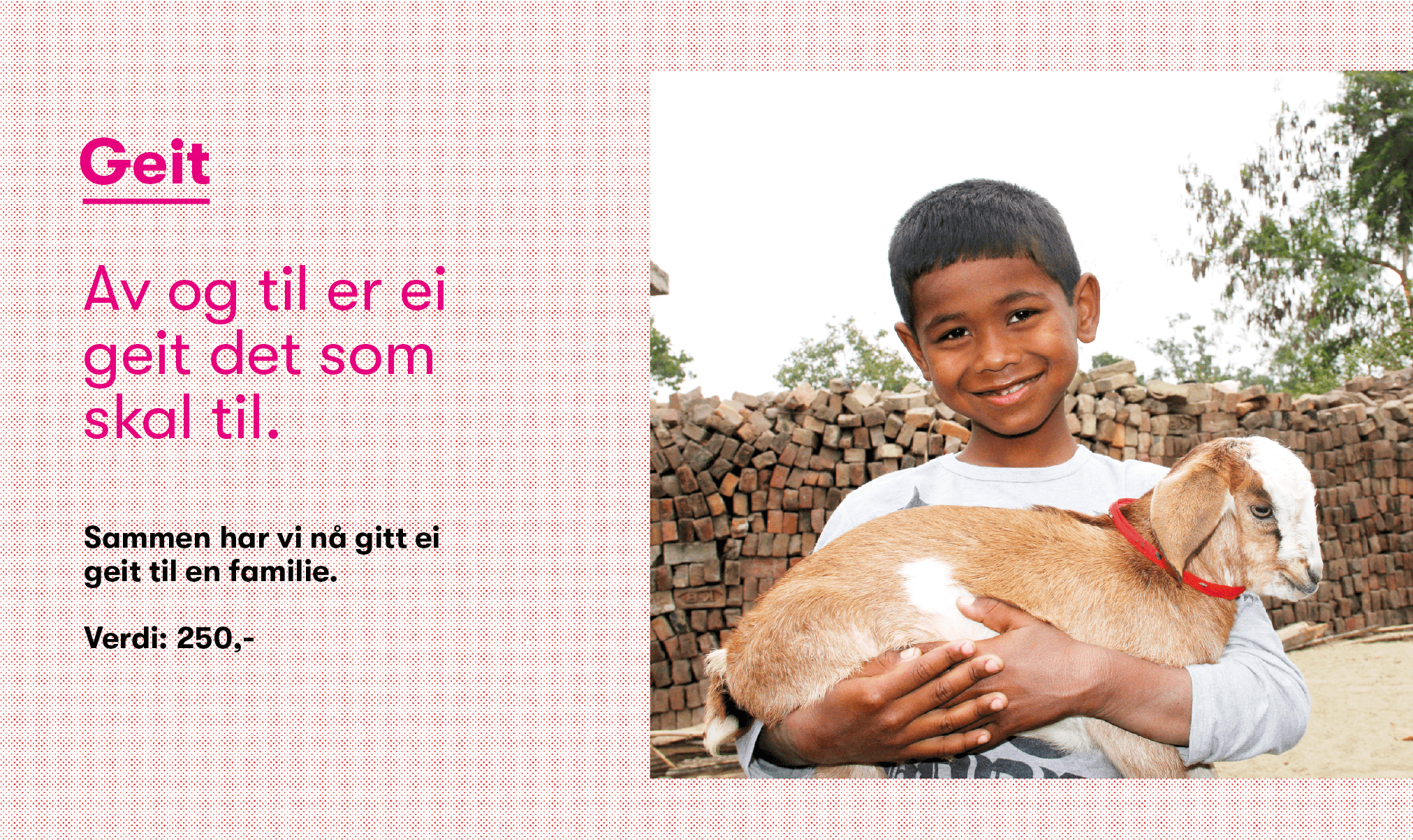 Geit er et genialt husdyr. Ikke bare kan de overleve under røffe forhold, ei geit får ofte flere killinger. Geiter bidrar med melk og kjøtt til husholdningen. Av geitemelk kan familien lage ost. Inntektene fra salg av melk og ost kan investeres. Kanskje kan familien etterhvert få råd til å dyrke grønnsaker eller å sende flere av barna på skolen?