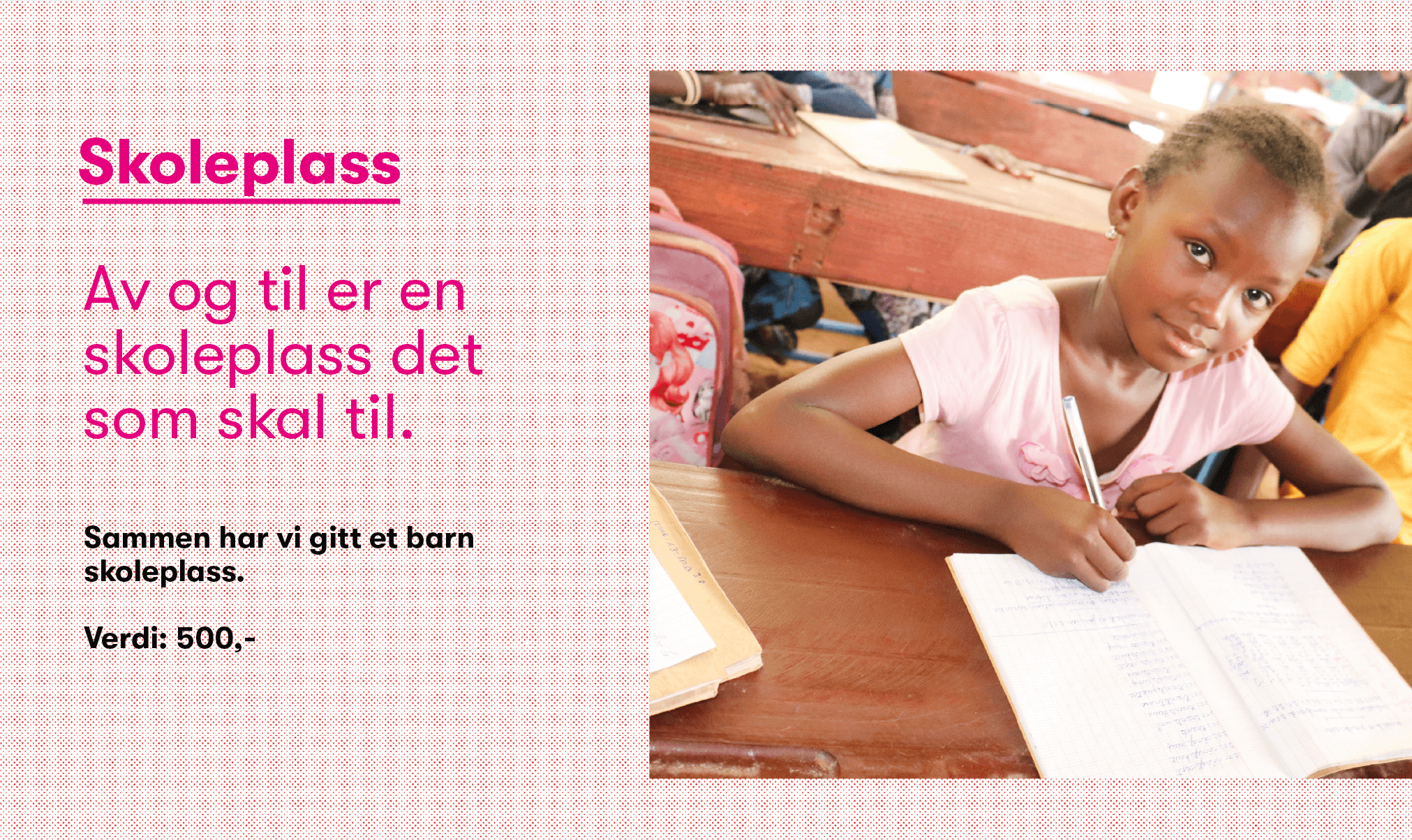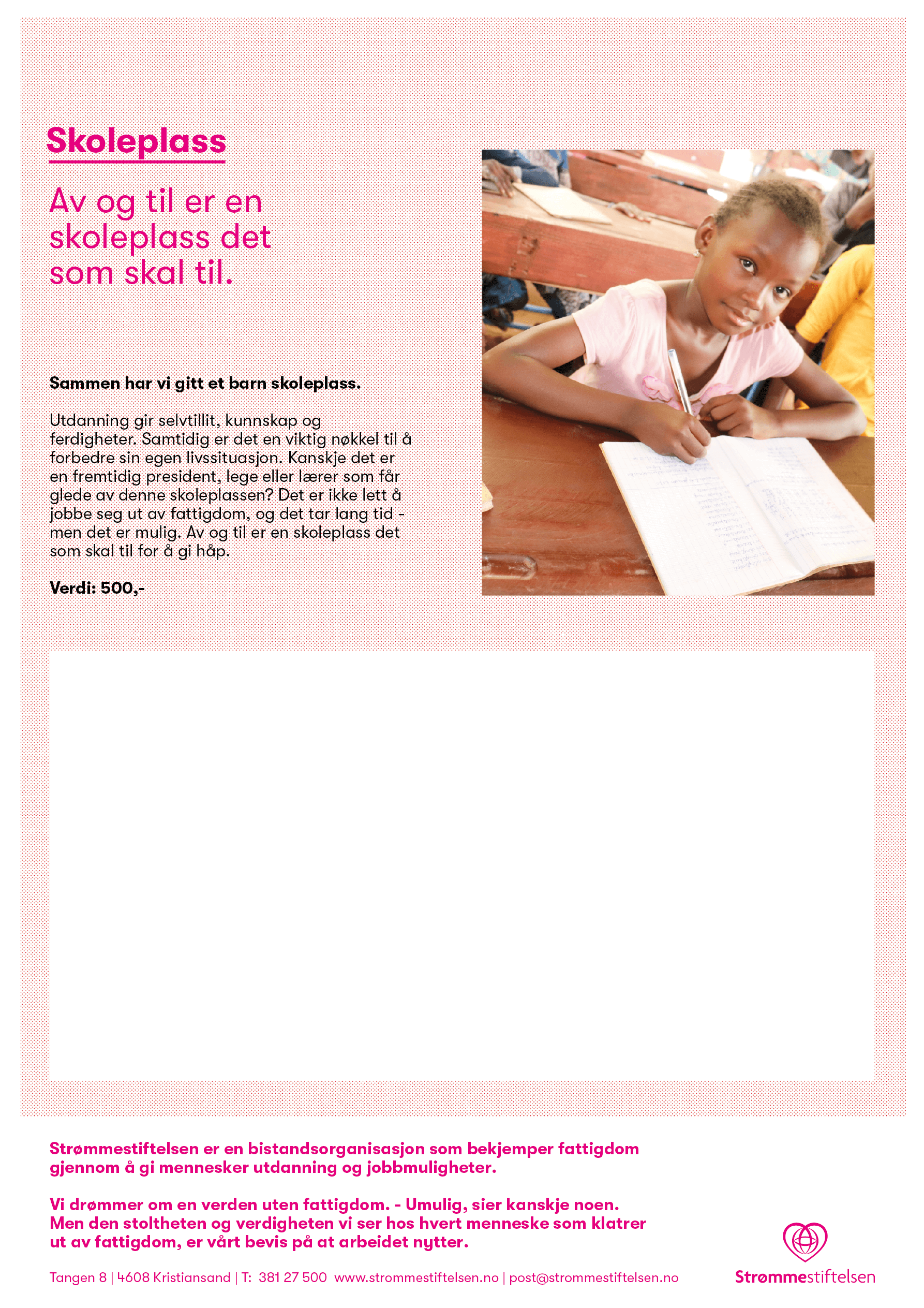 Utdanning gir selvtillit, kunnskap og ferdigheter. Samtidig er det en viktig nøkkel til å forbedre sin egen livssituasjon. Kanskje det er en fremtidig president, lege eller lærer som får glede av denne skoleplassen?